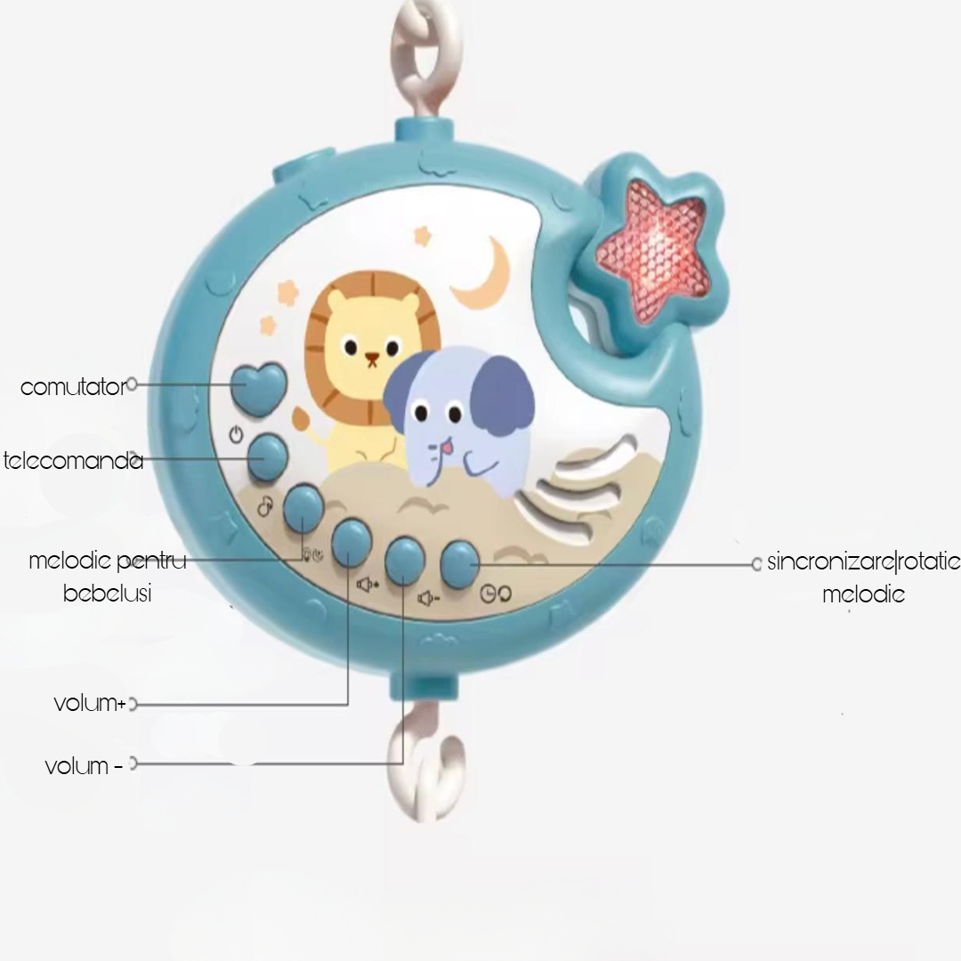 Carusel Muzical pentru Pătuț bebelus, Proiecție & Telecomandă | 0+ luni, 4 jucarii detasabile, Cantece de Leagan/Melodii Calmante, cu Telecomanda