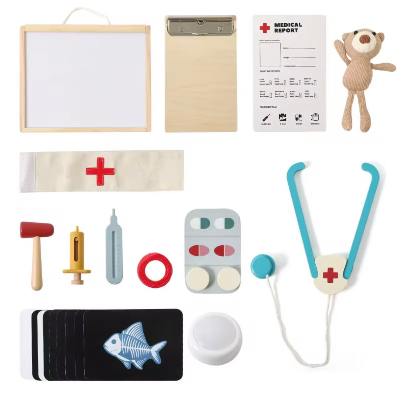 Set doctor din lemn, 14 piese, ideal pentru joacă creativă și dezvoltarea abilităților sociale și motorii. Realizat din lemn netoxic, finisaj neted, piese ușor de mânuit pentru mână mică.