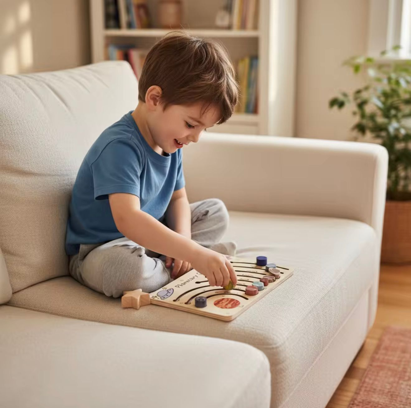 Jucărie educativă din lemn cu tematică spaţială care încurajează recunoașterea formelor și dezvoltarea motricității fine: 8 planete mobile ce pot fi alunecate pe trasee corespunzătoare orbitelor. Perfectă pentru joacă independentă și activități senzoriale.