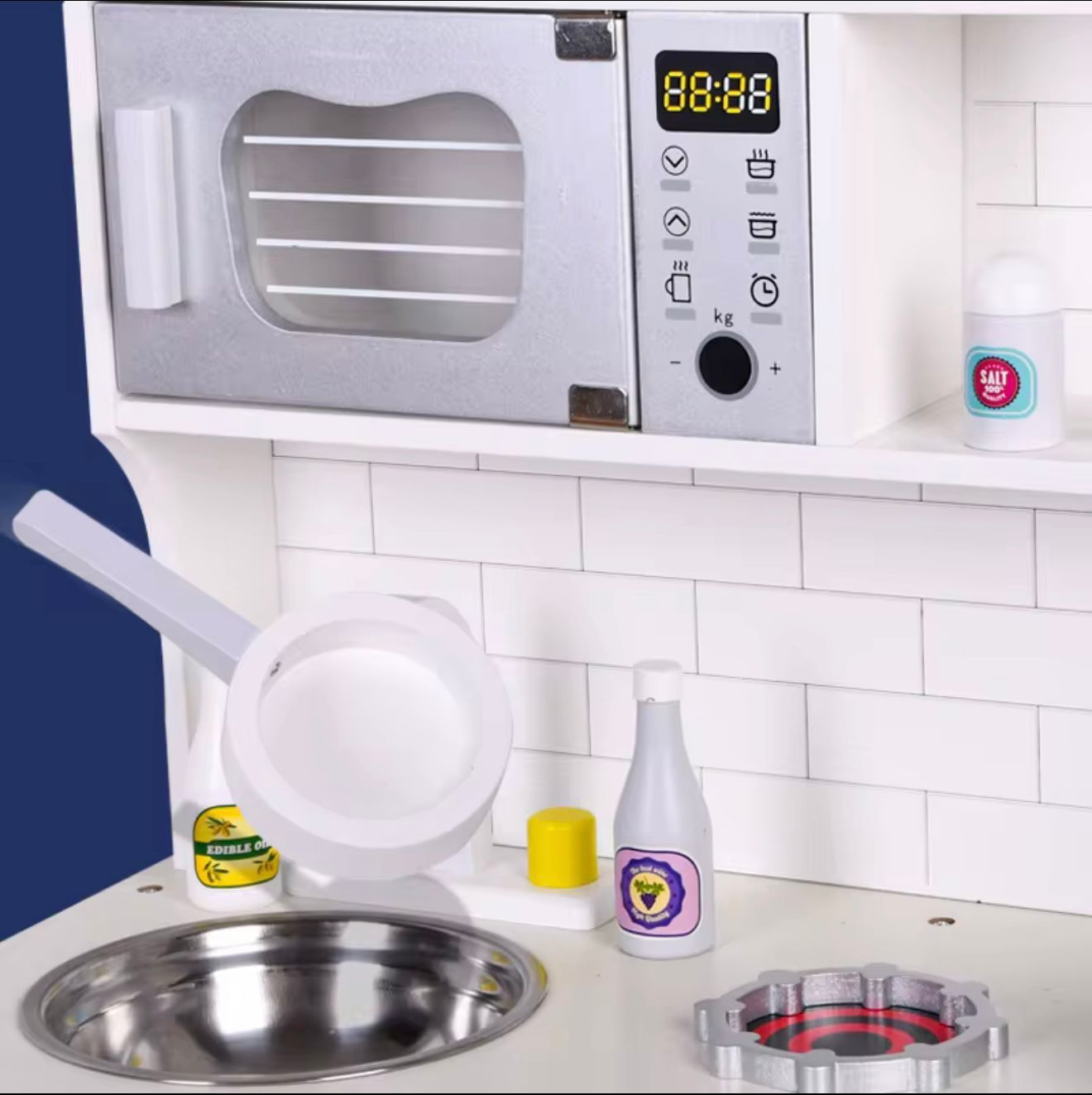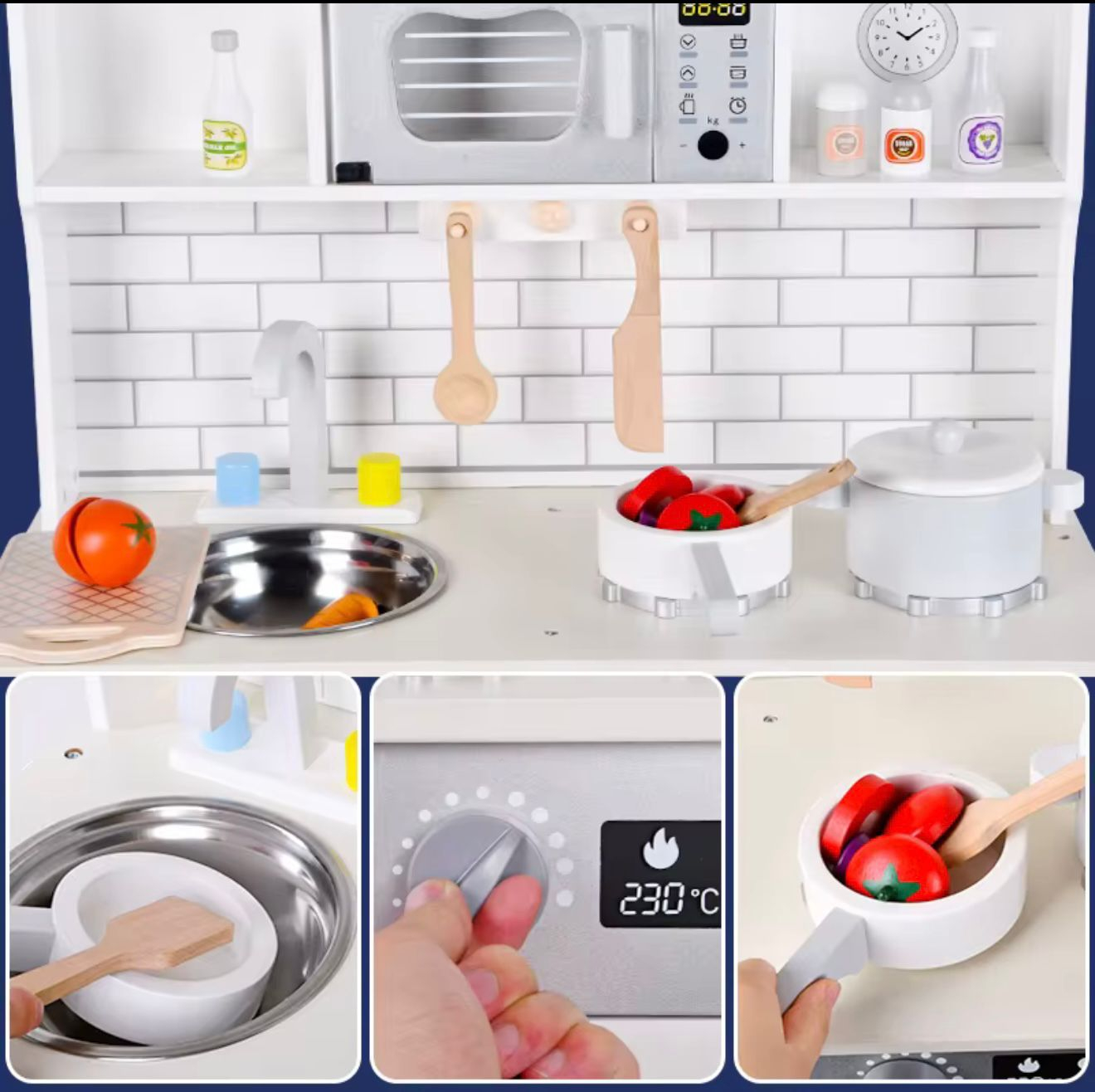 • Elemente interactive: butoane rotative care se întorc, mânere funcționale, cârlige pentru agățat ustensile, ceas decorativ — stimulează dexteritatea și jocul imaginative.
