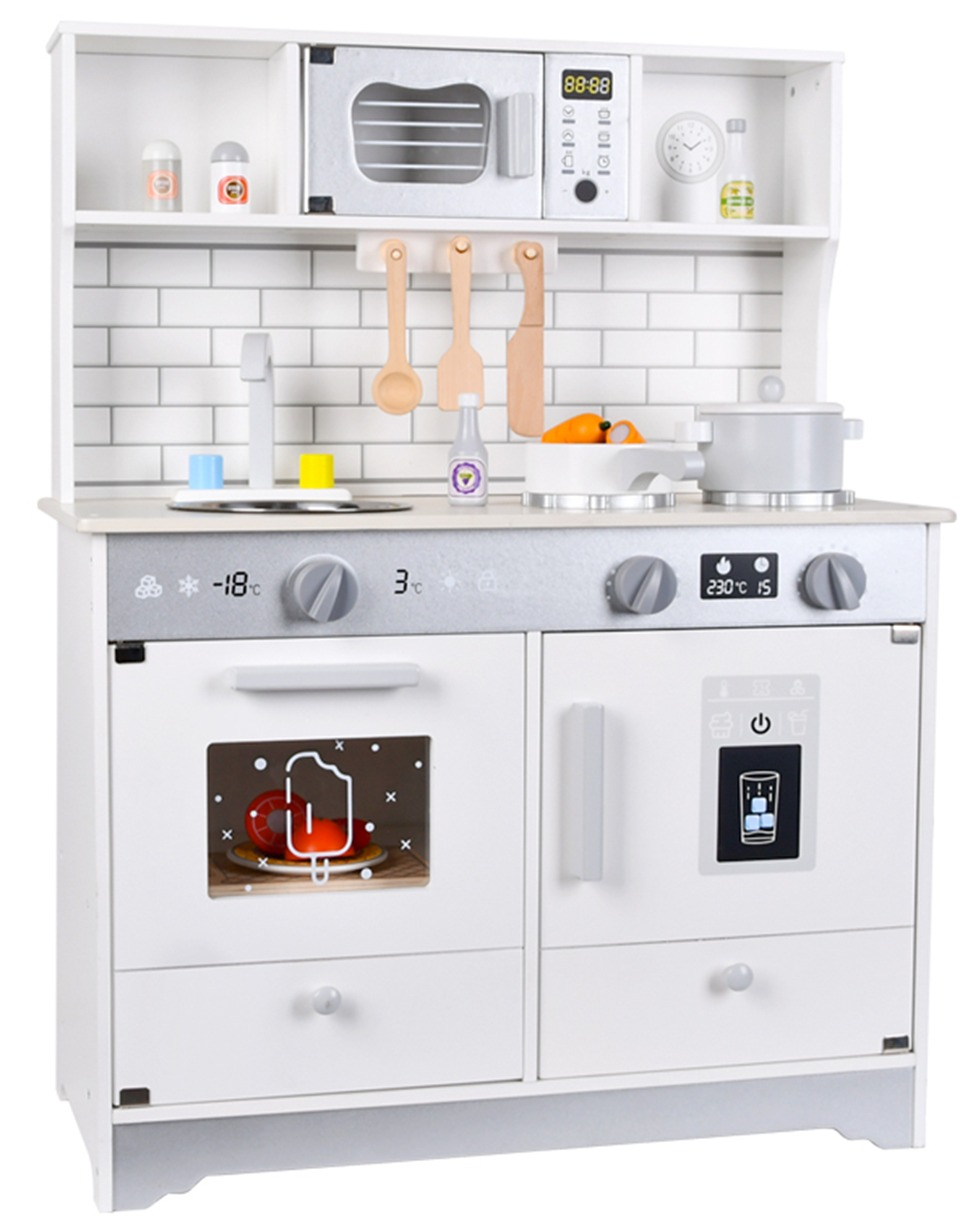 Bucătărie de jucărie din lemn pentru copii, alb 58 x 28 x 80 cm — set complet cu cuptor, plită, microunde, chiuvetă, robinet, sertare & rafturi de depozitare, accesorii (oală, tigaie, ustensile) 3+ an
