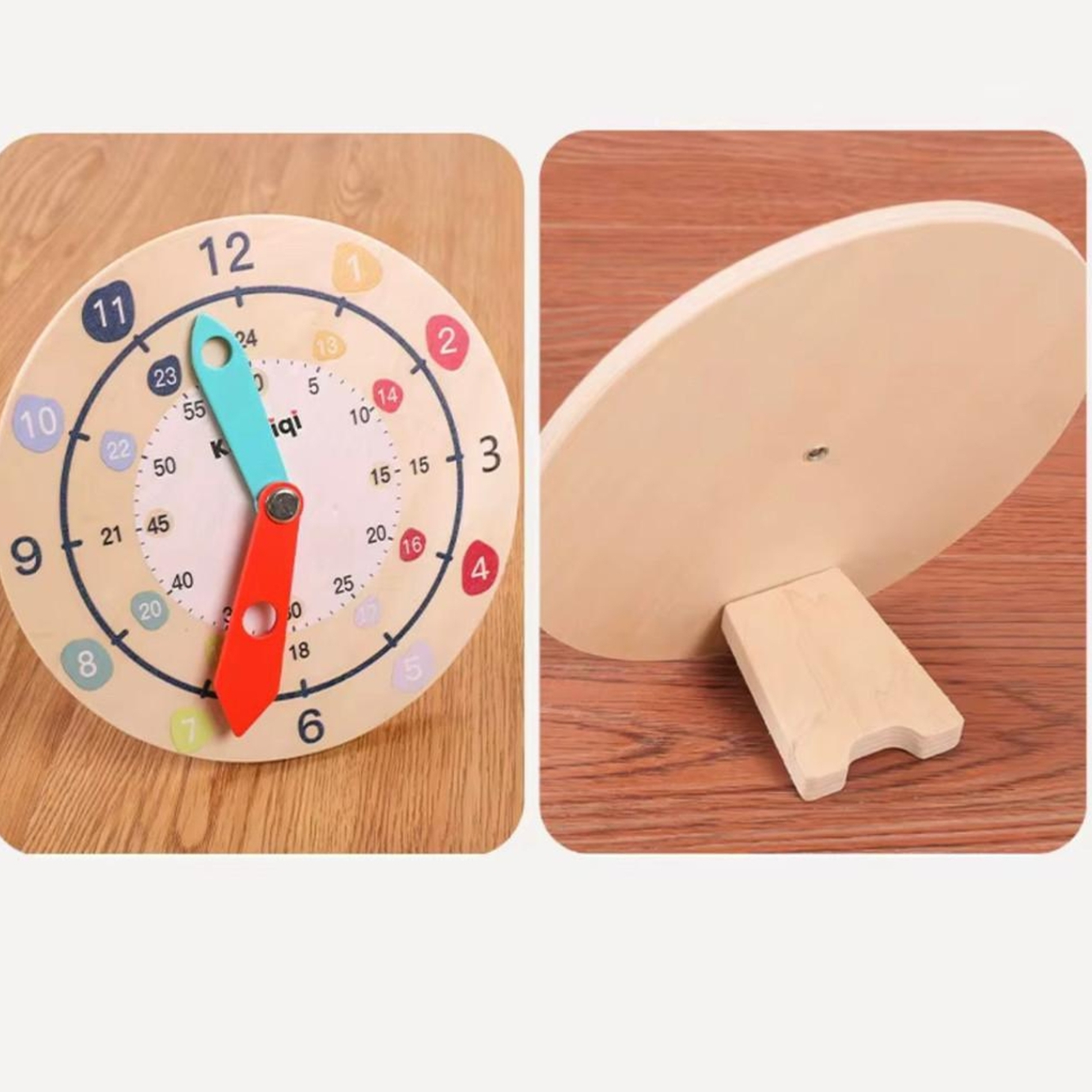 Ajută copiii să învețe si să citească ora cu acest ceas educațional din lemn, colorat și prietenos. Dispune de ace mobile pentru ore și minute, marcaje clare pentru minute (0–59) si ore (1–12), ideale pentru înțelegerea conceptelor de timp.