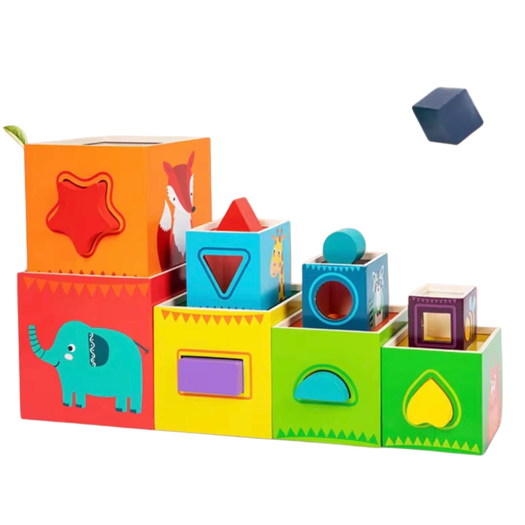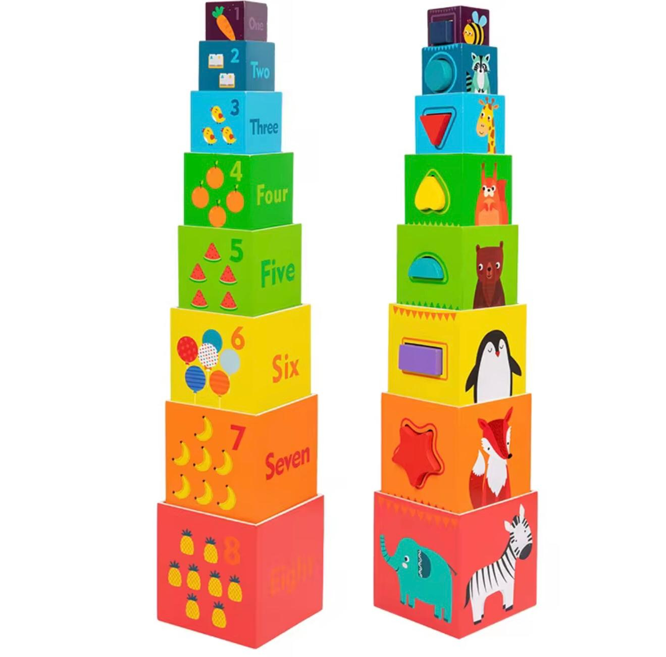 Caracteristici: • 8 cuburi de dimensiuni diferite – pot fi stivuite sub formă de turn sau introduse unul în celălalt. • Numere de la 1 la 8 – fiecare cub reprezintă vizual un număr cu obiecte ilustrate (banane, portocale, baloane etc.). • Animale adorabile • Forme geometrice – cerc, triunghi, inimă, stea și alte forme tactile pentru recunoaștere și învățare. • Culori vii și atrăgătoare – stimulează vizual copilul și menține atenția la joacă.