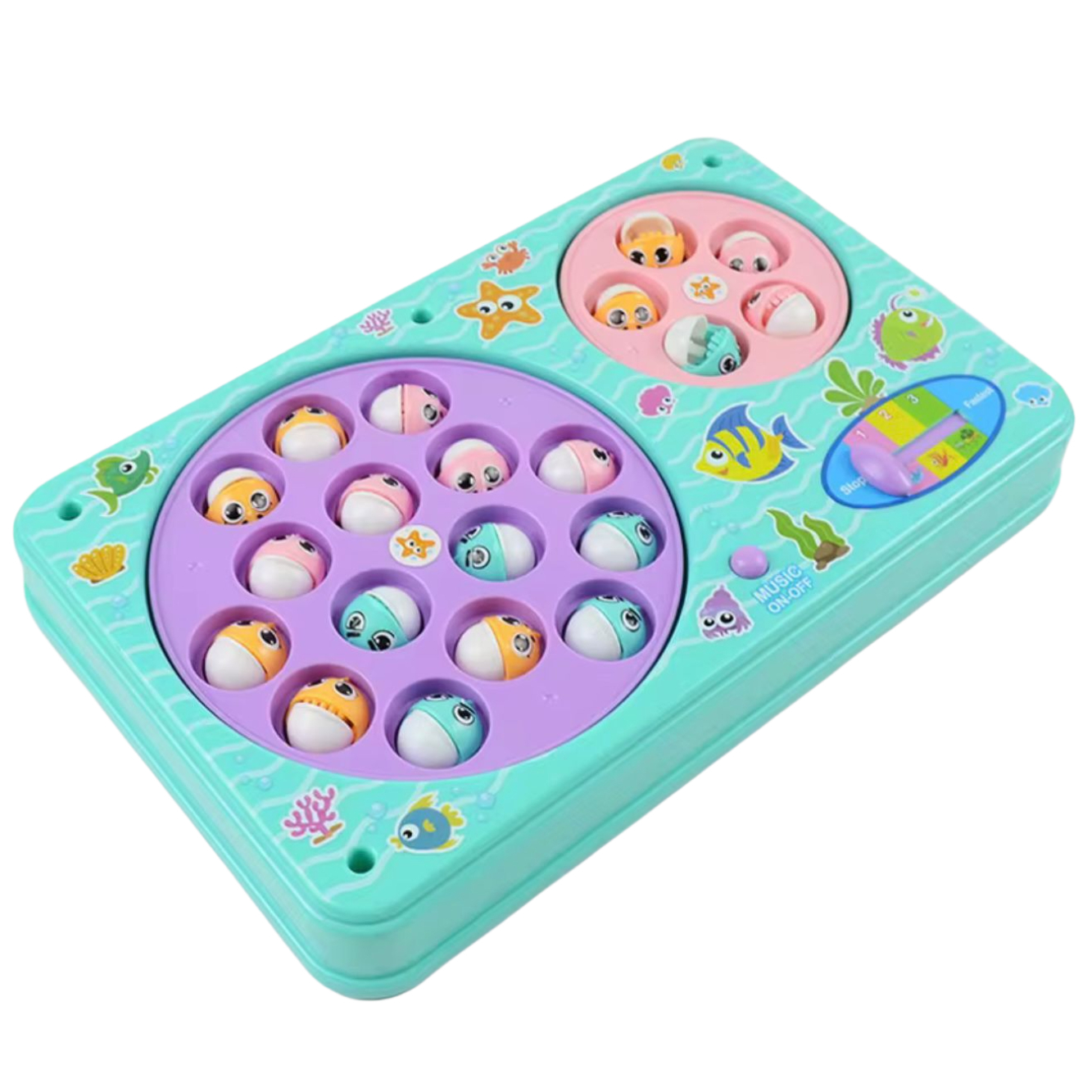 Jocul se pornește, iar platforma începe să se rotească. Peștișorii se mișcă și deschid gurile într-un ritm amuzant, iar jucătorii trebuie să îi prindă cu undițele magnetice. Câștigă cel care pescuiește cei mai mulți pești! Beneficii pentru copii: