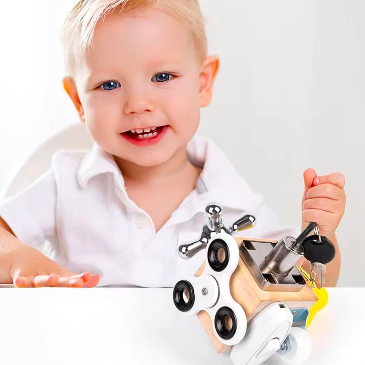 Oferă-i celui mic o experiență de învățare distractivă și sigură cu această jucărie Montessori tip busy cube, special creată pentru a stimula curiozitatea și dezvoltarea abilităților esențiale. Realizată din lemn rezistent și accesorizată cu elemente tactile variate, jucăria îi ajută pe copii să își dezvolte motricitatea fină, coordonarea mână–ochi și gândirea logică. Caracteristici principale: