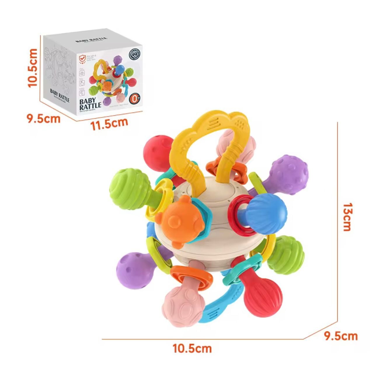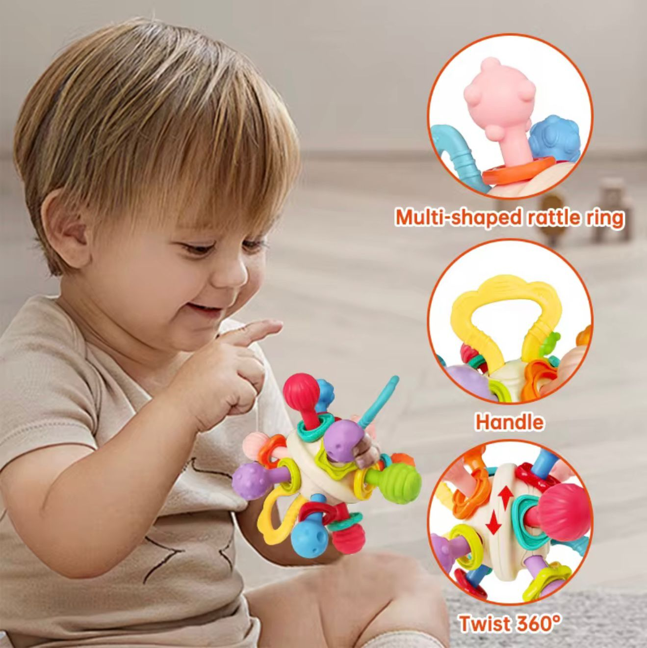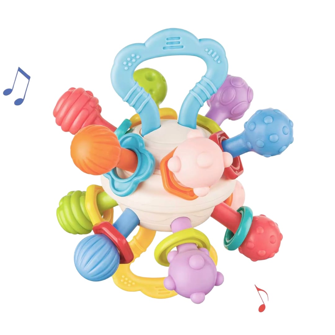 Această jucărie senzorială colorată este perfectă pentru primele luni de viață ale bebelușului, oferind o combinație ideală de texturi, sunete, mișcare și forme care sprijină dezvoltarea motricității fine și explorarea tactilă. Concepută special pentru mâinile mici, jucăria include multiple brațe zornăitoare, inele mobile și o parte centrală ce se poate răsuci la 360°, menținând interesul copilului pentru mult timp.