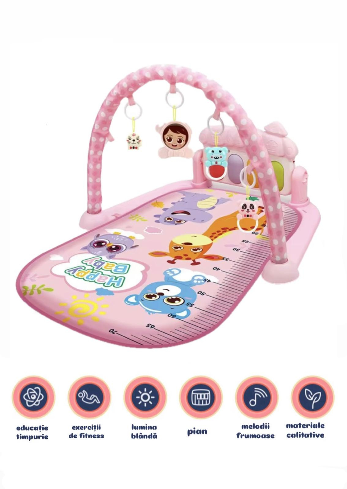 Salteluță interactivă, centru de activitati pentru bebelusi 0+, cu pian si jucării suspendate, dimensiune 76 x 56 x 46 cm, roz