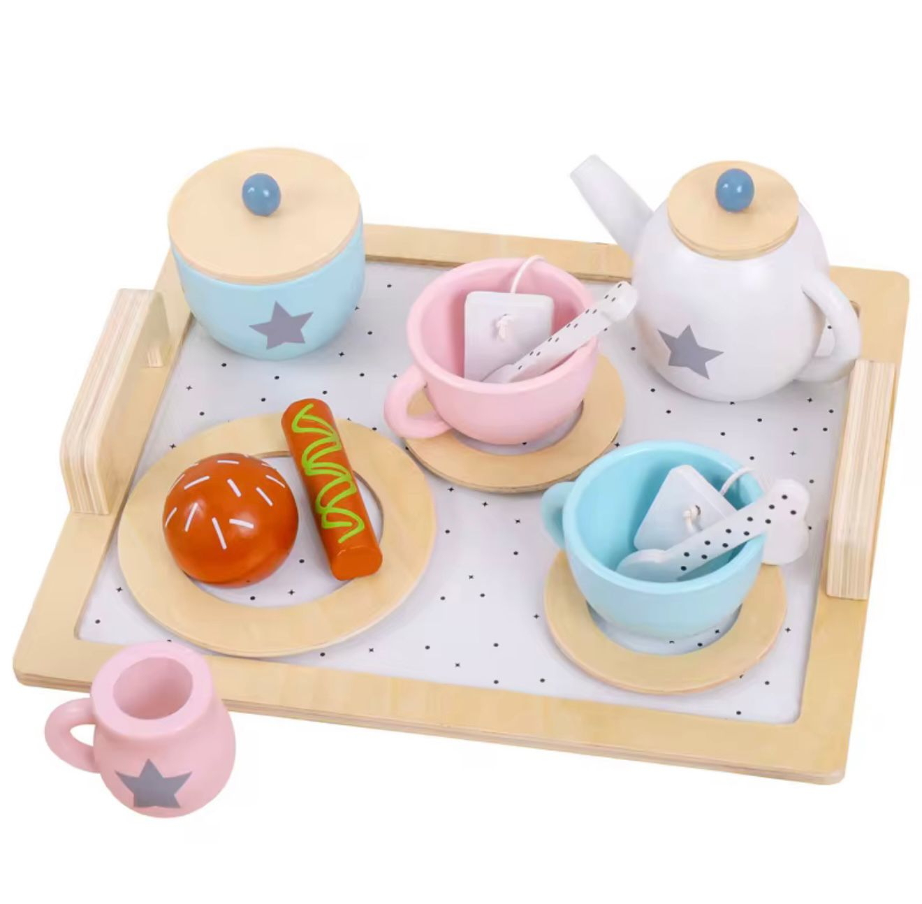 Set de joacă, realizat din lemn vopsit non-toxic, ideal pentru jocuri de rol și petreceri de ceai pentru copii. Include tavă cu mânere, ceainic cu capac, 2 cești cu farfurii, zaharniță, lingurițe și accesorii. Design pastelat, detalii cu steluțe, finisaj neted și piese ușor de manevrat pentru mâinile mici.