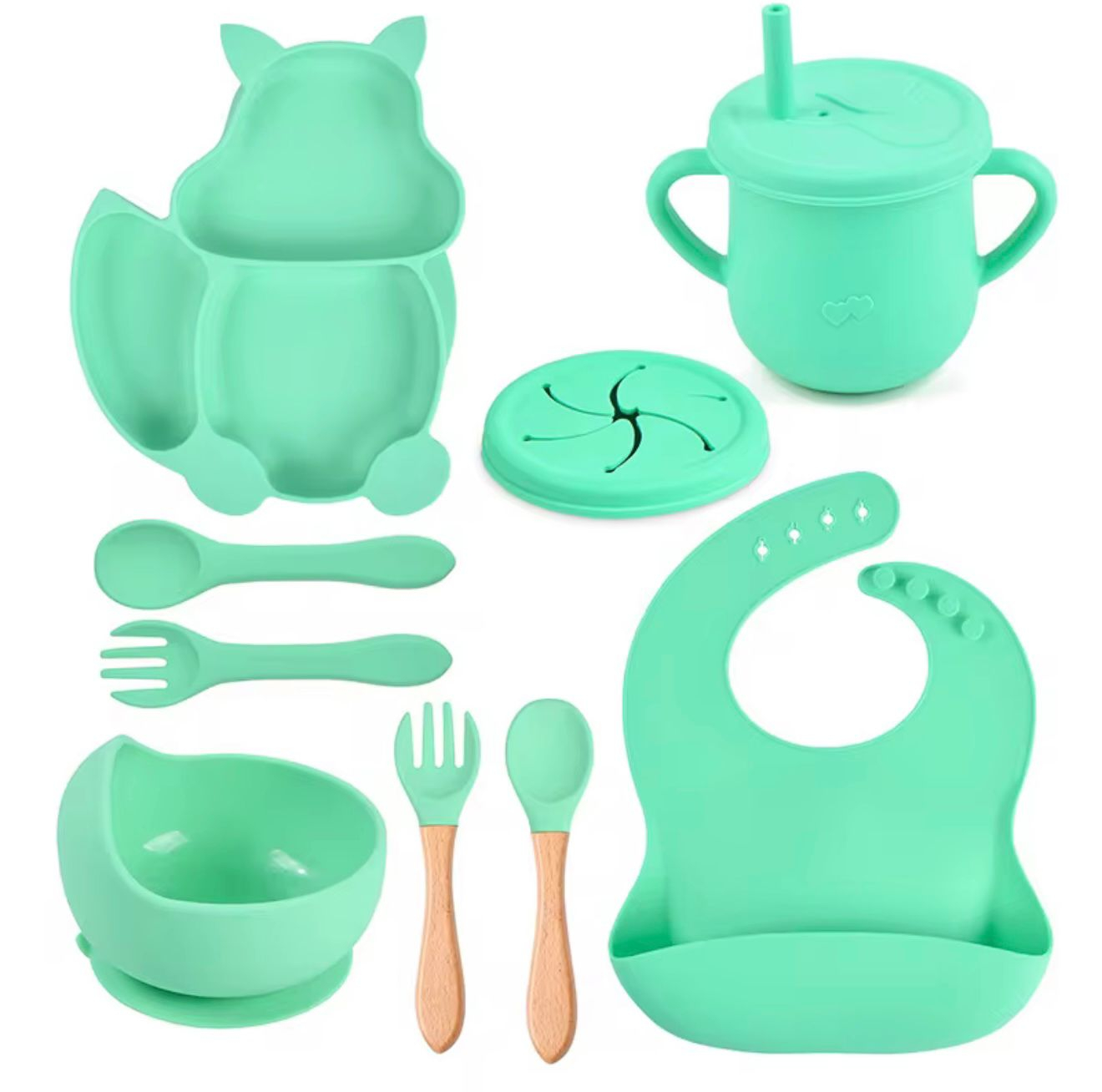 Set hranire din silicon pentru copii – 8 piese, din silicon BPA free, 6+ luni, farfurie, bol, pahar, bavetica, tacamuri, Set pentru diversificare
